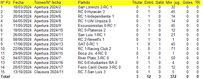 Debut oficial en Central: 18 de marzo de 2024, vs. San Lorenzo de Almagro 1-2 (V)